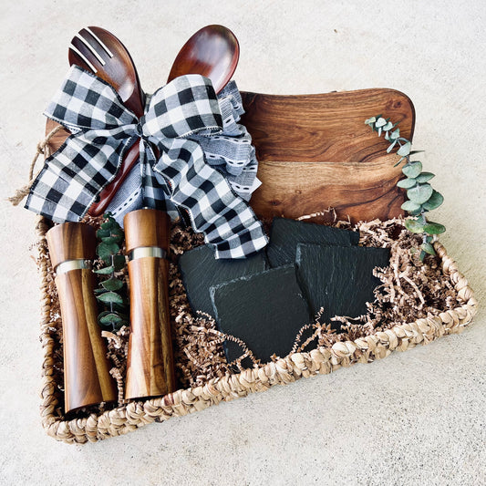 Custom Gift Basket- Rustic Acacia Board + Slate Coasters + Salt/Pepper Grinders + Serving Spoon Set with Towel
