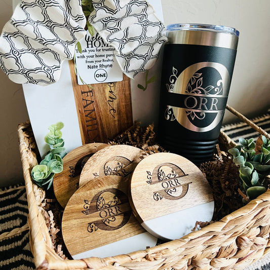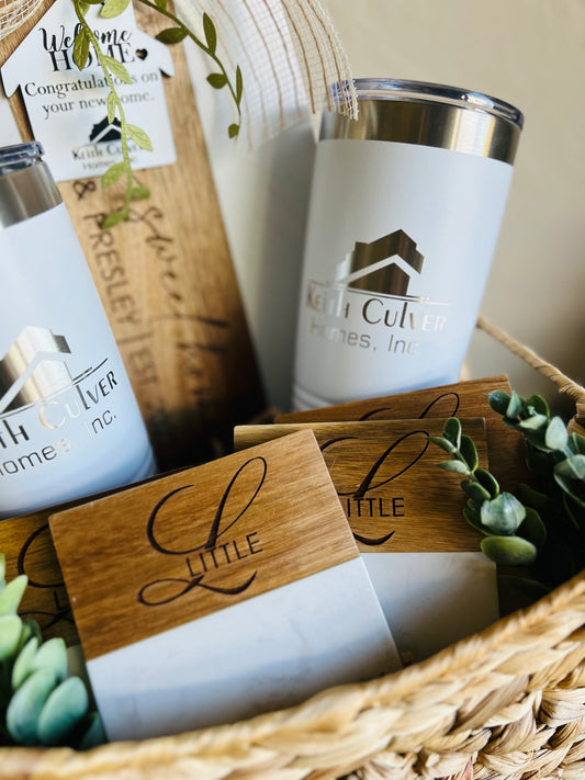 Custom Gift Basket- Marble & Wood Serving Board + Coasters + Tumbler
