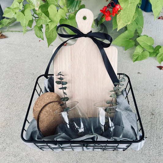 Custom Gift Basket- Wood Board + Cork Coasters + Towel + Wine Glasses