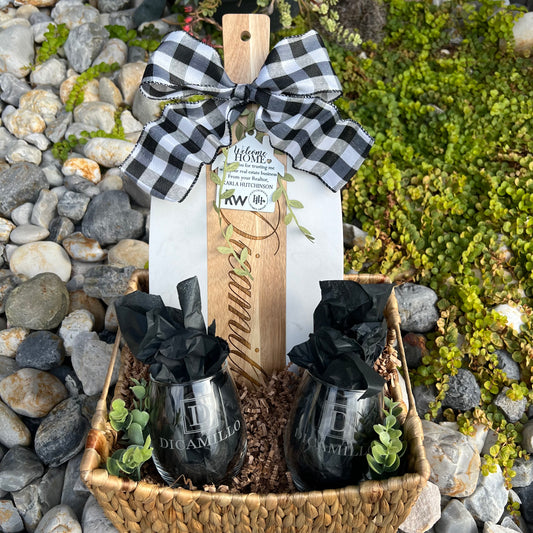 Custom Gift Basket- Marble & Wood Serving Board + Wine Glasses