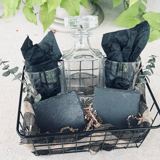 Custom Gift Basket- Glass Decanter + Slate Coasters + Rock Glasses