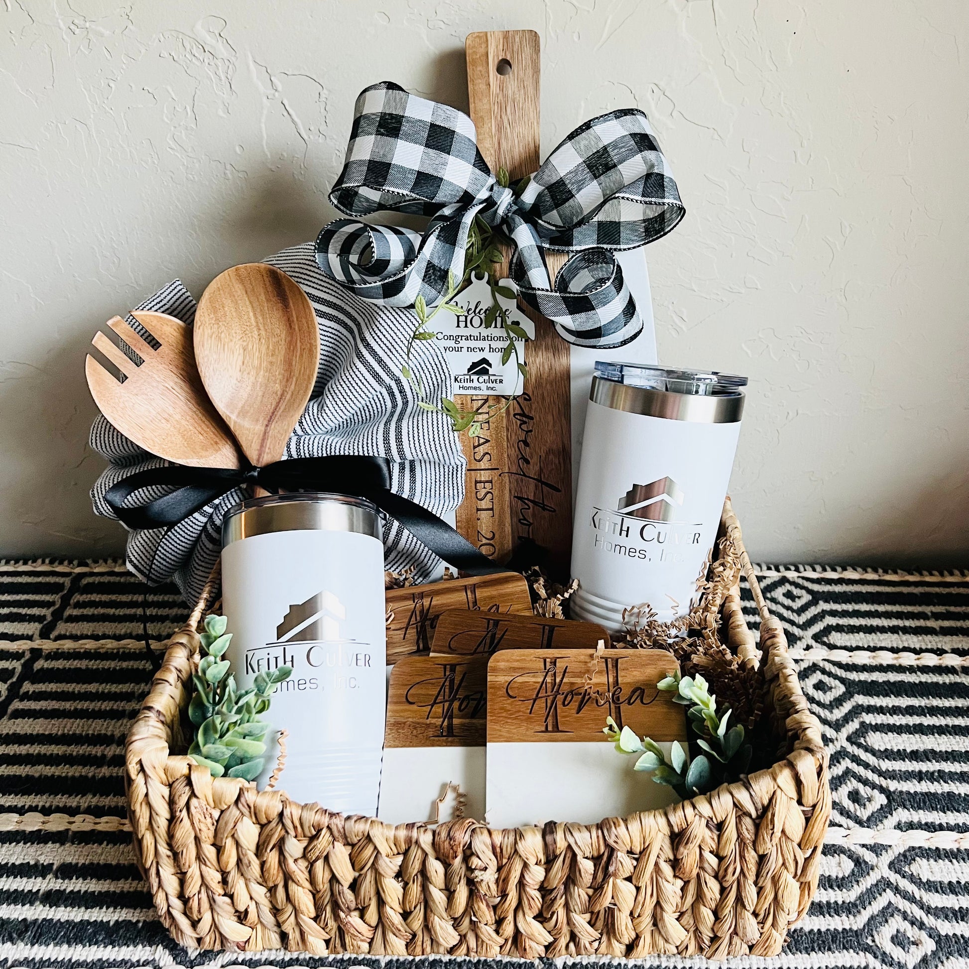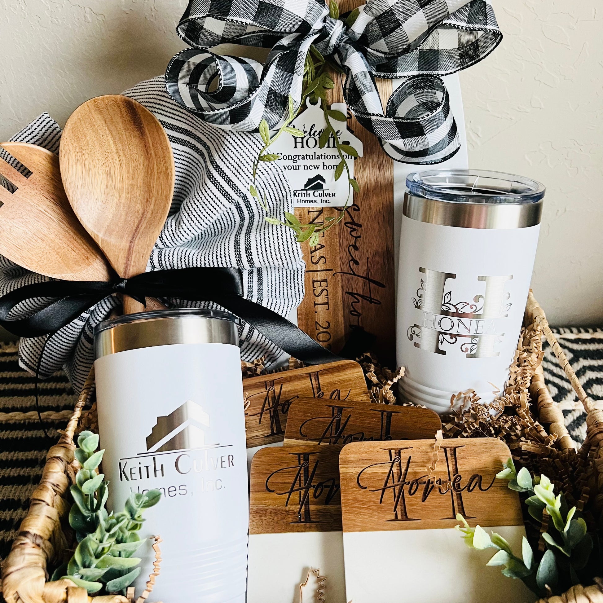 Custom Gift Basket- Marble & Wood Serving Board + Coasters + Serving Spoon Set with Towel + Tumblers